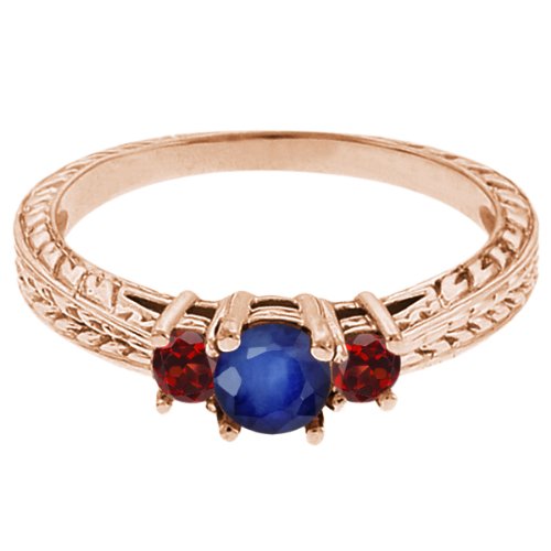 0.60 Ct Round Blue Sapphire Red Garnet 18K Rose Gold 3-Stone Ring